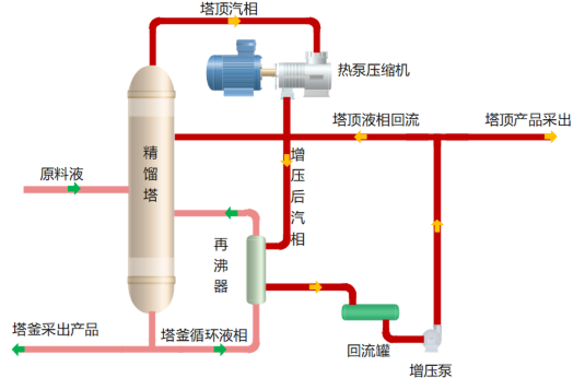该项目使用热泵压缩机对精馏塔顶气进行增压,以提高其温度品位,再将其送往塔釜再沸器作为热源使用,替代原本蒸汽热源,从而大幅减少一次蒸汽以及塔顶冷却水耗量,从工艺上实现精馏过程的节能减碳。