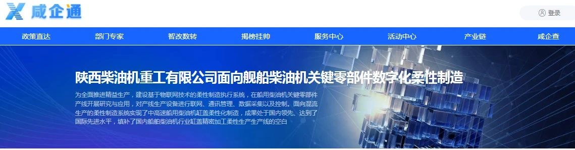 近日,中国船舶陕柴重工申报的数字化典型应用场景《基于三维环境的数字化工艺设计系统》成功入选陕西省2024年数字化典型应用场景名单;《面向JC柴油机关键零部件数字化柔性制造》在咸阳市委、市政府设立的综合性服务平台“咸企通”网站首页作为典型案例进行展示推广。