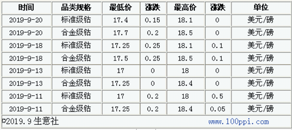 由表可以看出,MB钴价稳中有升,国际钴价大幅上涨,带动国内钴价上涨。截止9月20日,MB钴价报价17.7-18.5美元/磅,国际钴价稳步上涨,对国内钴价有利好影响,促进国内钴价上涨。