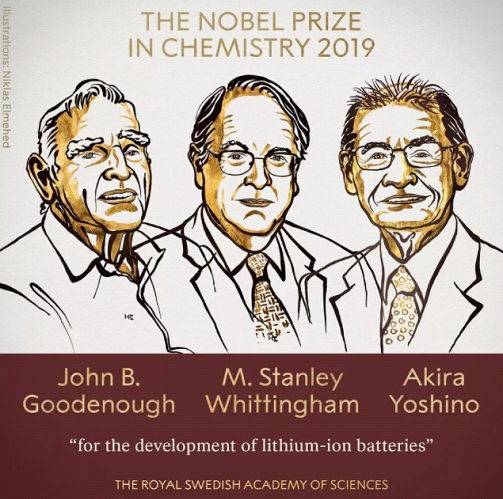 2019年诺贝尔化学奖授予John B. Goodenough, M. Stanley Whittingham, Akira Yoshino,以表彰他们在锂电池领域的贡献。