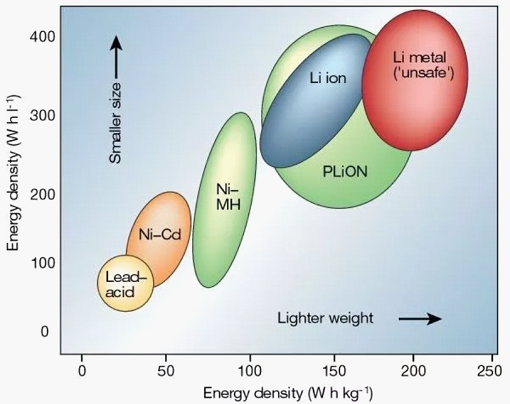 不同的电池技术在体积和重量能量密度方面的对比