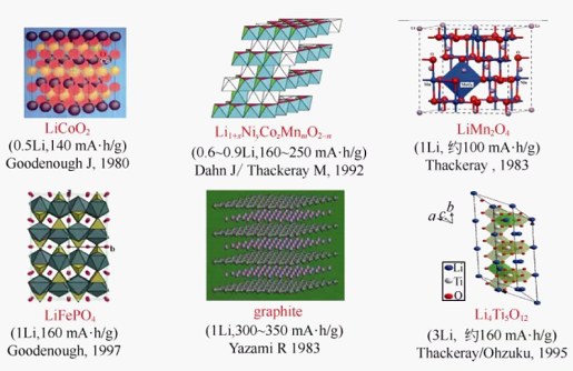 商业锂离子电池正负极材料的示意图、主要发明人、发明时间