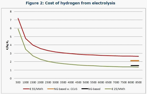 法国国际关系研究所表示,与普遍持有的看法相反,因为不需要贵重材料,超大规模的电解槽价格仅为400欧元/千瓦,并不十分昂贵。因此,如果其容量系数(或利用率)每年不低于3000个满负荷小时(FLH),甚至可以大于5000FLH,则电解成本将由电力成本而不是电解槽成本决定。