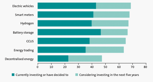 智能电表和氢储能在当前和计划投资模式中也表现突出,分别有41%和40%的受访者选择这两种非发电能源技术。