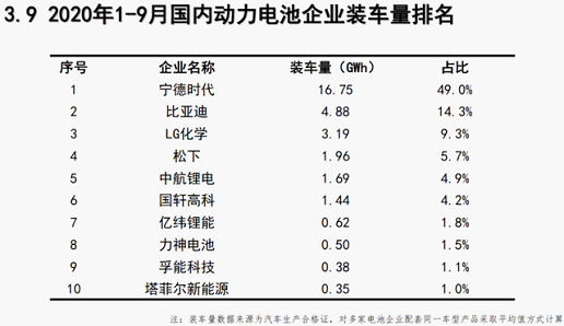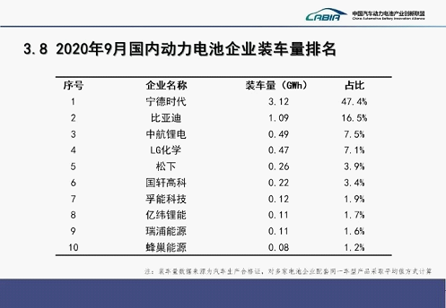 企业集中度水平,2020年9月,我国新能源汽车市场共计51家动力电池企业实现装车配套,较8月份增加7家。排名前3家、前5家、前10家动力电池企业动力电池装车量分别为4.7GWh、5.4GWh和6.1GWh,占总装车量比分别为71.4%、82.4%和92.2%。