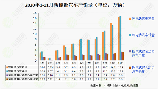 其中,11月,新能源汽车产销分别完成19.8万辆和20万辆,同比分别增长75.1%和104.9%,其单月产销第5次刷新了当月历史记录。其中纯电动汽车产销分别完成16.4万辆和16.7万辆,同比分别增长66.2%和100.5%;插电式混合动力汽车产销均完成3.3万辆,同比分别增长136.4%和128.9%;燃料电池汽车产销分别完成288辆和290辆,同比分别增长7.2倍和28倍。