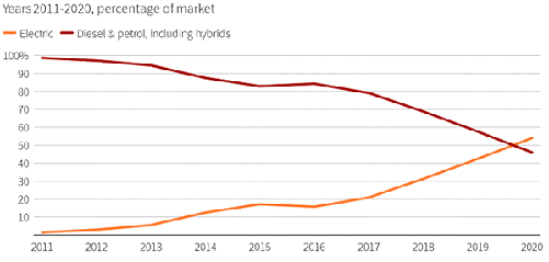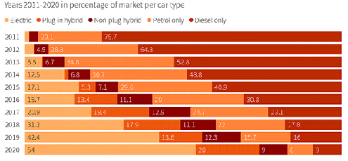 如果一个国家真的想推广电动车,其实也很容易,把乘用车的油价提高一点就可以了。事实上,还真有国家这么做了,就是挪威。作为欧洲最注重环保理念的国家之一,挪威虽然是个产油大国,是世界第七大和西欧最大的石油生产国,但是,挪威却拥有着全球最高的油价。当前,挪威汽油价格在16元/升左右,为全球之最。正是在高额的油价倒逼下,即使位于高纬寒冷地带,挪威人普遍选择购买纯电动车型。近日,据挪威公路联合会(OFV)周二发布的数据,2020年该国电动车销量占全市场比例达到54.3%,成为全世界首个全年电动车销量占比过半的国家。短短十年间,电动车在挪威的市占率从区区1%上升至超越半数,高油价和高纯电动车补贴功不可没。从具体数据来看,挪威2020年总共销售了141,412辆新车,其中76,789辆为纯电动车。