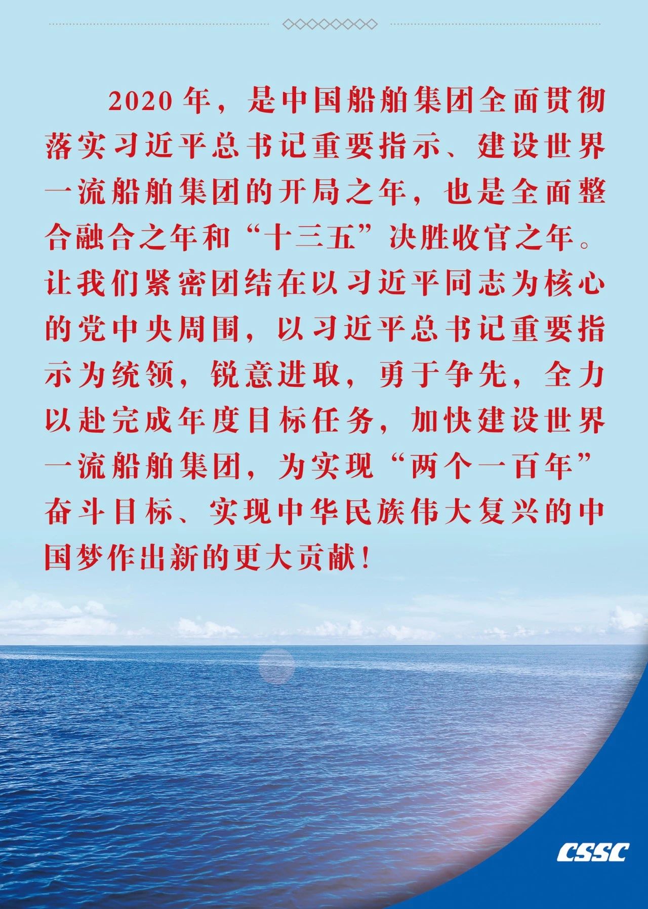 1月19日,在中国船舶集团有限公司2020年度工作会议上,中国船舶集团党组书记、董事长雷凡培作了题为《以习近平总书记重要指示为统领 奋力开启建设世界一流船舶集团新征程》的工作报告。