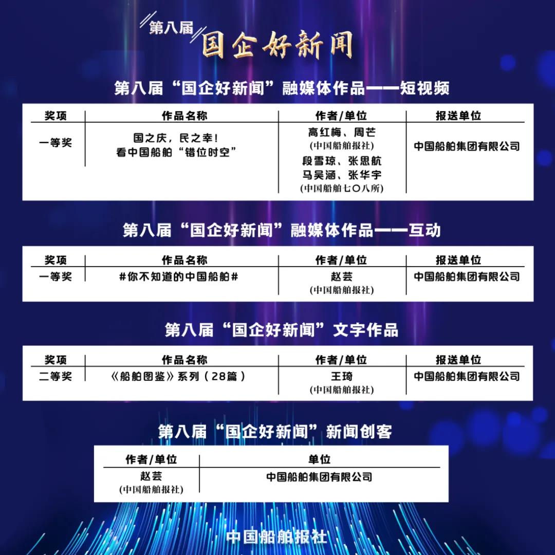 1月11日,第八届“国企好新闻”获奖作品正式揭晓,中国船舶集团斩获4项大奖,涵盖系列报道、短视频、融媒体作品等多种体裁。其中,一等奖2项、二等奖1项,并首次荣膺十大新闻创客奖,获奖名单如下: