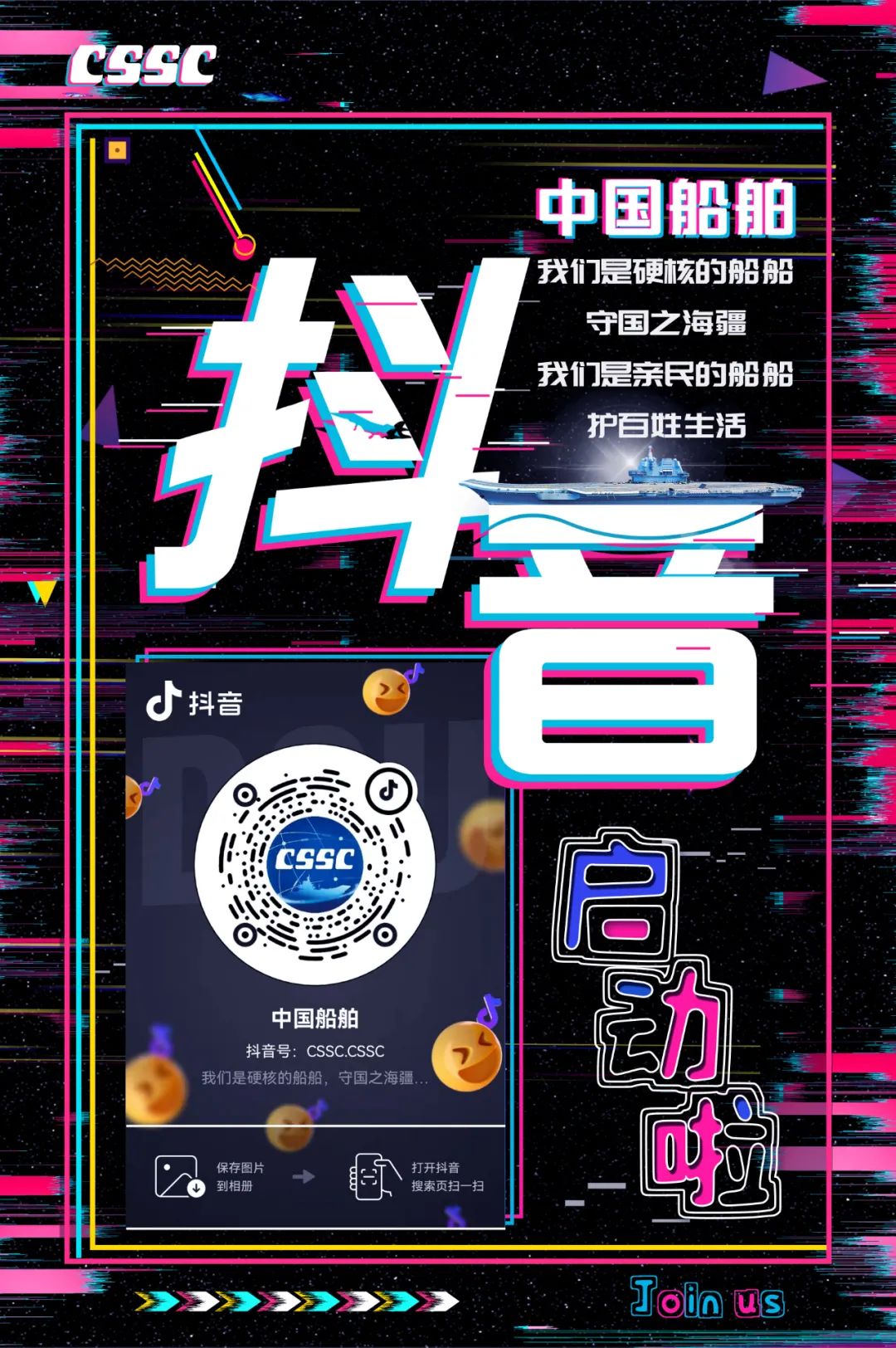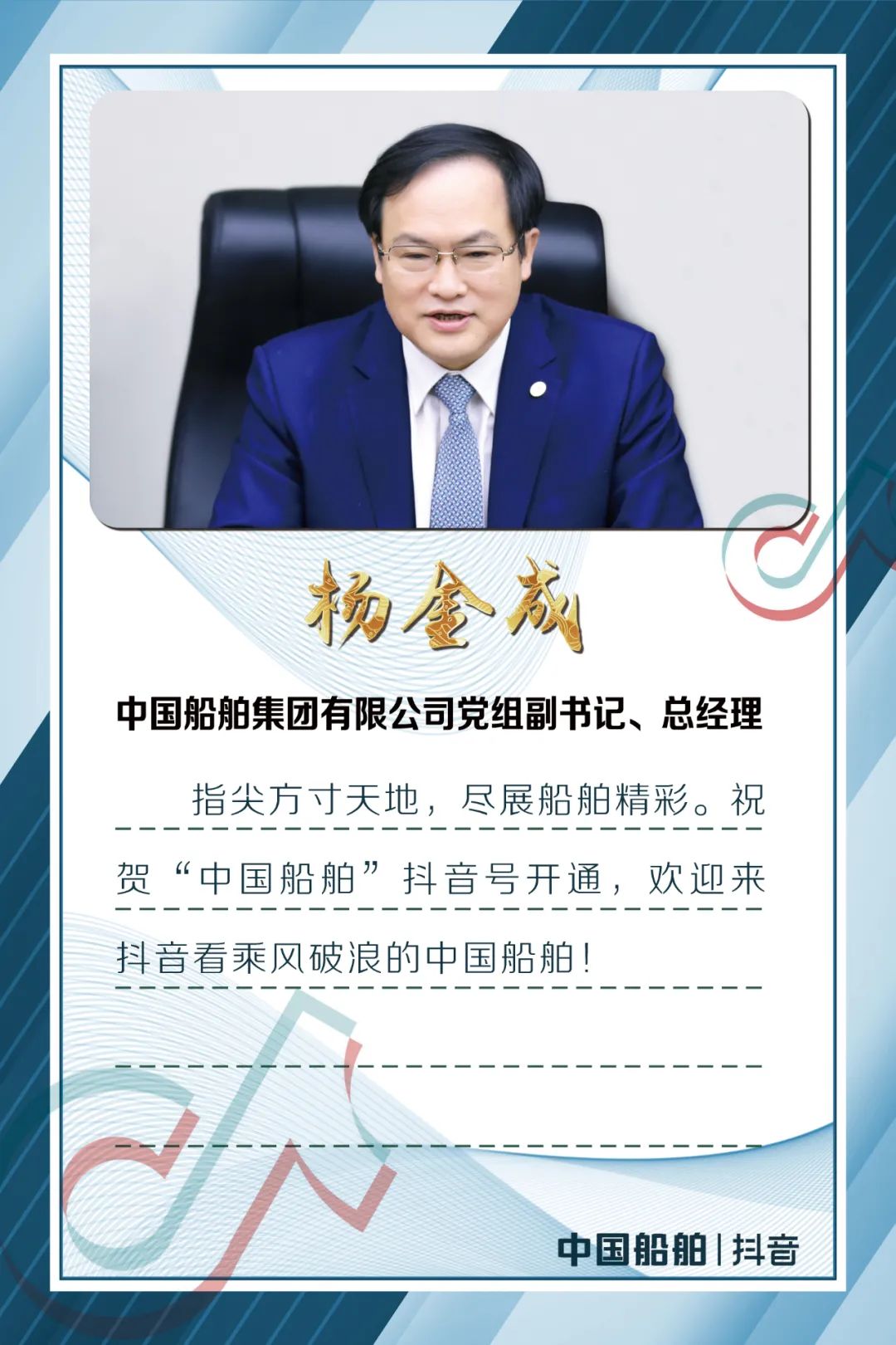 今天,中国船舶官方抖音平台正式开通,是集团公司构建全媒体宣传矩阵的重要举措,是社会各界关心海洋、认识海洋、经略海洋的重要平台,是弘扬军工精神和中国船舶“三大精神”的重要阵地。