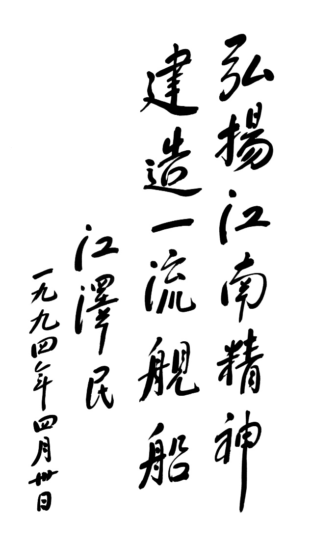 1994年4月30日,江泽民同志为江南造船题词“弘扬江南精神,建造一流舰船”。