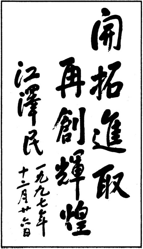 1997年12月26日,江泽民同志为中国船舶工业总公司题词:“开拓进取,再创辉煌”。
