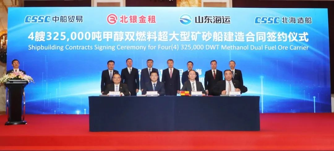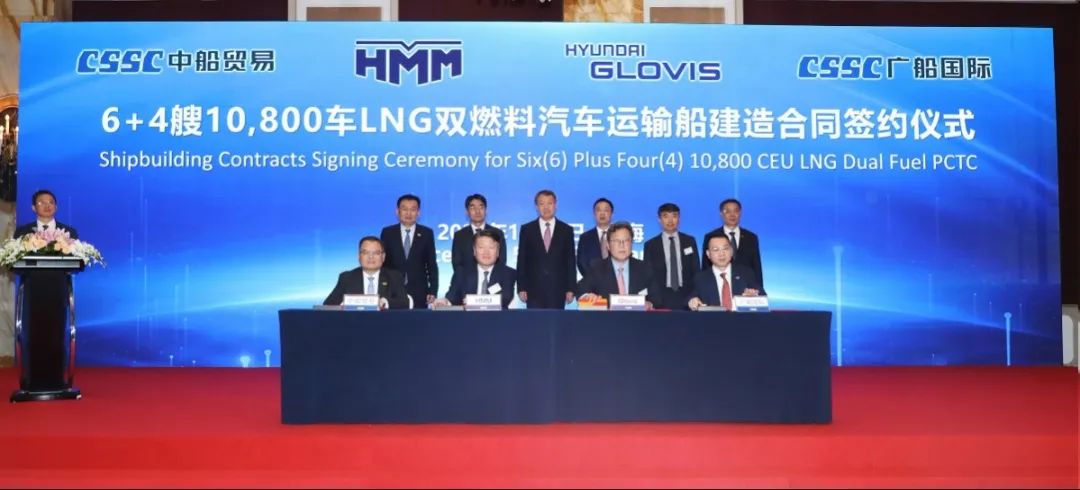 签约仪式上,外高桥造船、中船贸易与Seaspan、现代Glovis签署了6+4艘10800车LNG双燃料PCTC船项目;广船国际、中船贸易与HMM、现代Glovis签署了6+4艘10800车LNG双燃料PCTC船项目;北海造船、中船贸易与北银金租、山东海运签署了4艘325000吨超⼤型甲醇双燃料矿砂船项目;江南造船、中船贸易与太平洋气体签署了3艘99000方VLEC船项目;黄埔文冲、中船贸易与Benelux公司签署了2+1艘48000方LPG船项目;中船澄西、中船贸易与工银金租签署了4艘82600吨散货船项目;大连造船与七二五所青岛双瑞签署了15000TEU集装箱船甲醇供应系统项目。