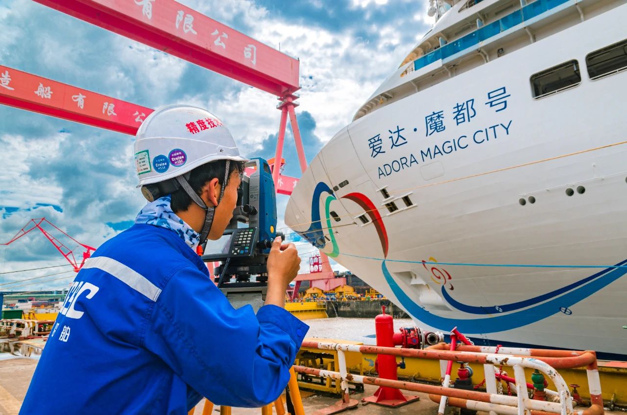 精度技术部的员工正在监测国产首艘大型邮轮试航归来时的精准坐墩数据。