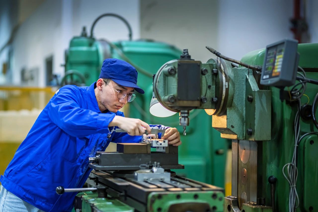 在武汉船机平台生产现场,一名机床操作师傅,正在对加工后的零件进行检测,专注的表情展现了船舶人严把质量关,人品以诚心为本,企品以恒心为要,产品以匠心为重的精神风貌。