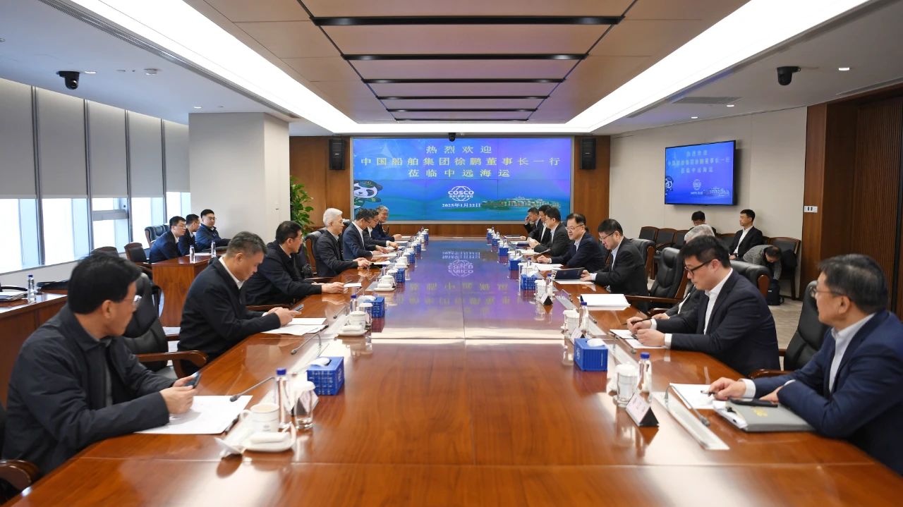 1月22日,中国船舶集团有限公司党组书记、董事长徐鹏一行拜会中国远洋海运集团有限公司党组书记、董事长万敏。双方围绕深入贯彻落实党的二十届三中全会精神和中央经济工作会议精神、加快绿色和数字化转型、携手推动我国航运业和造船业高质量发展等主题,进行了深入交流,并达成了共识。Beat365唯一官方网站党组成员、副总经理胡贤甫,中远海运集团党组成员、副总经理、总会计师孙云飞参加会谈。