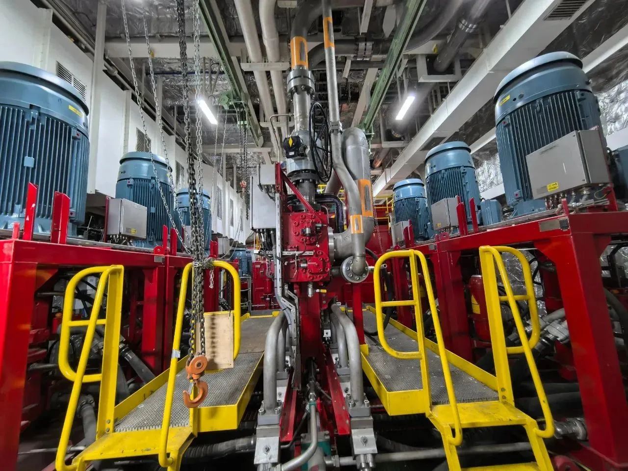 “梦想”号钻井系统提升能力强、反应速度快,离不开配套的液压提升系统。系统配有12台泵,装机容量达4100千瓦,高压管路长达8000多米,直径达270多毫米,最高压力为350公斤/平方厘米,是家庭高压锅耐压的175倍。
