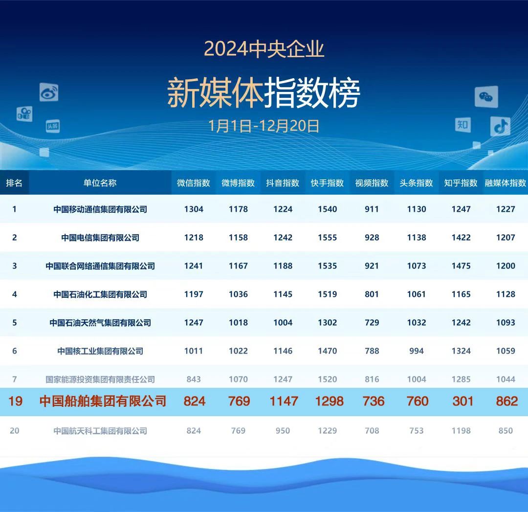 2024年,中国船舶微信、微博、抖音、快手、视频号、头条号、知乎七大新媒体平台运营亮点频出、多点开花,综合表现突出:“中国船舶”新媒体指数位列“中央企业新媒体指数榜”第19位、“2024年度中国企业500强新媒体指数榜”第23位!
