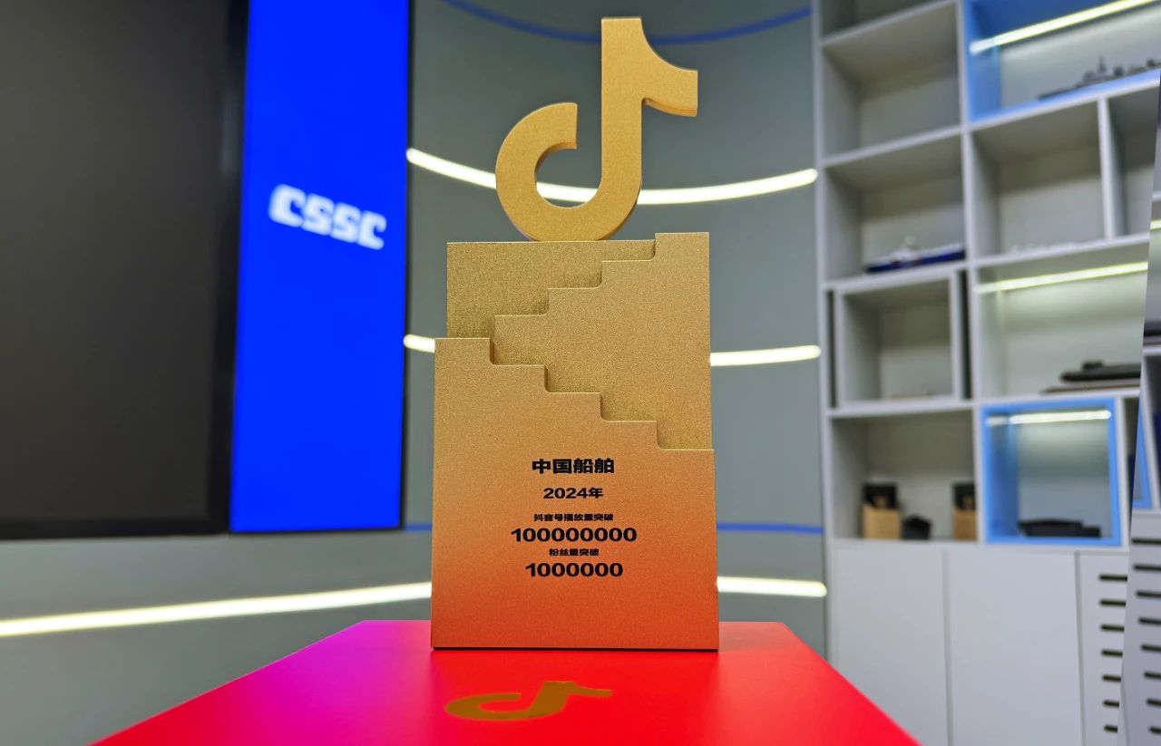 2024年,“中国船舶”抖音号获得“播放量突破 100000000”“粉丝量突破 1000000”荣誉。