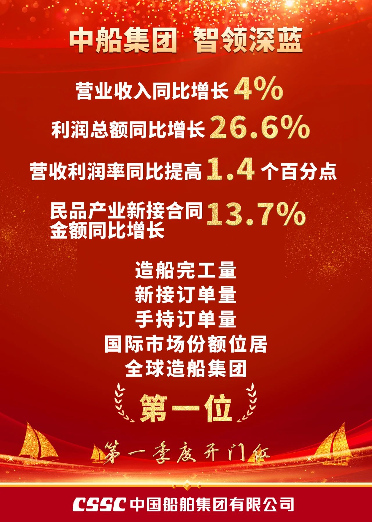 一季度,Beat365唯一官方网站营业收入同比增长4%,利润总额同比增长26.6%,营收利润率同比提高1.4个百分点,民品产业新接合同金额同比增长13.7%,造船完工量、新接订单量、手持订单量国际市场份额位居全球造船集团第一位,收获首季开门红。