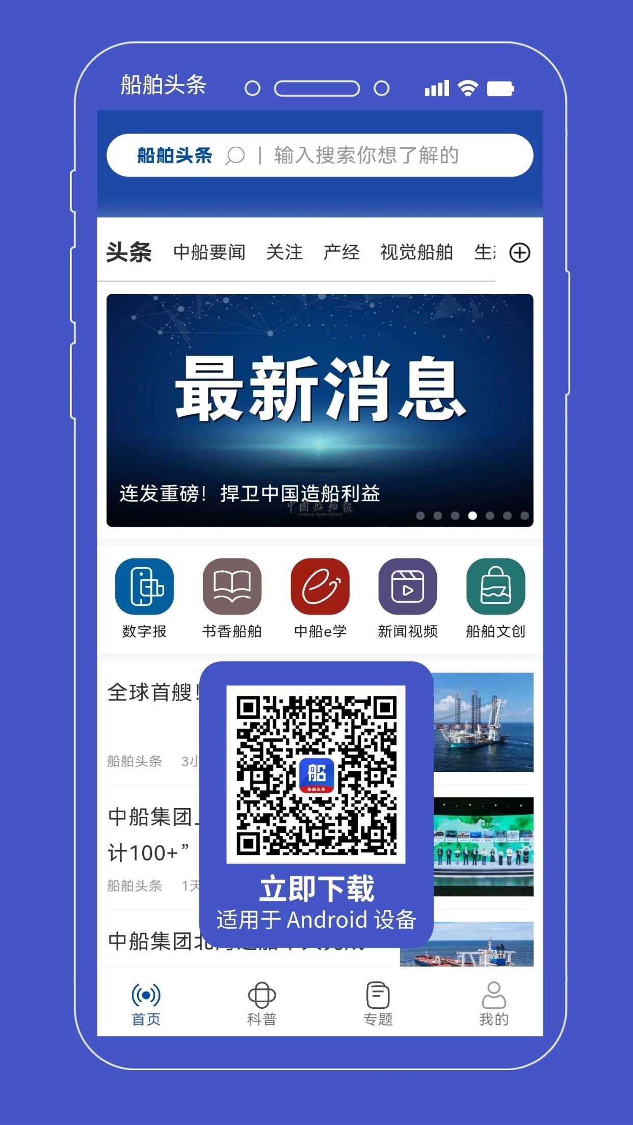 “船舶头条”App聚焦海洋装备产业链,集新闻发布、融合传播、专业解读、科普宣传、企业智库、服务聚合等功能为一体,设有“头条”“中船要闻”“关注”“产经”“视觉船舶”“生态圈”6个精品频道以及“科普”“专题”等功能版块,并链接“书香船舶”“《中国船舶报》数字报”“中船e学”“新闻视频”“船舶文创”等多个服务端口,目前支持安卓系统下载使用。
